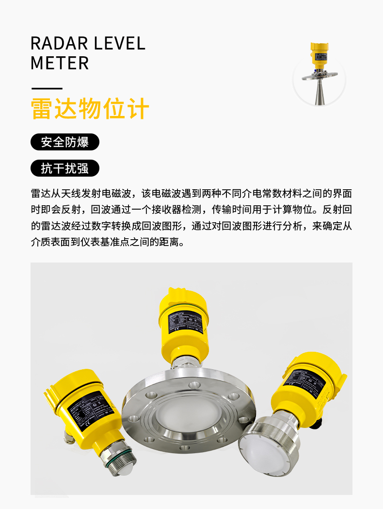雷达物位天线发射较窄的微波脉冲,经天线向下传输。微波接触到被测介质表面后被反射回来再次被天线系统接收,将信号传输给电子线路部分自动转换成物位信号(因为微波传播速度极快,电磁波到达目标并经反射返回接收器这一来回所用的时间几乎是瞬间的)。