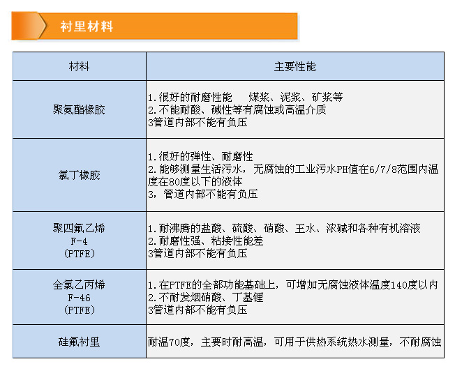 | 衬里材料 | 聚氨酯橡胶、氯丁橡胶、聚四氟乙烯 硅氟衬里 |