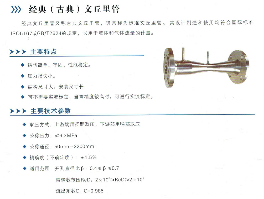 文丘里管工作原理概述文丘里管是一种常用的流量测量仪器,它利用了流体通过狭窄管道时产生的压力降来计算流速。文丘里管的结构简单,主要由一个狭窄的入口段、一个扩张段和一个收缩段组成。当流体流经狭窄的入口段时,流速会增加,同时在入口段后产生负压。通过测量这个负压,我们可以计算出流体的流速。