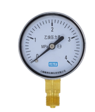 乙炔压力表在工业生产过程中是用来测量乙炔气体的特殊压力表。乙炔压力表的测量系统由接头与弹簧管组成,由于被测压力的变化使弹簧管自由端产生位移,借连杆带动扇形传动齿轮端部的指针旋转,在度盘指示相应压力数值